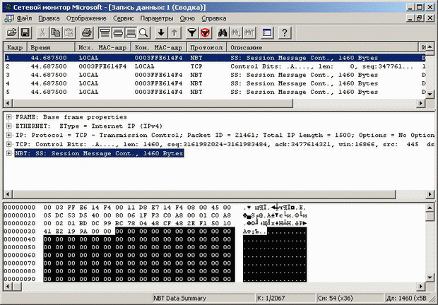 - верхняя панель — полный список захваченных "Сетевым монитором" фреймов;