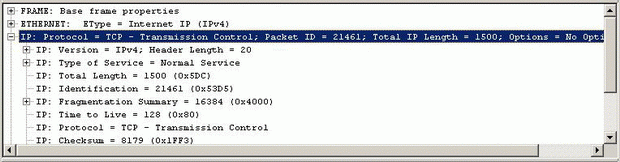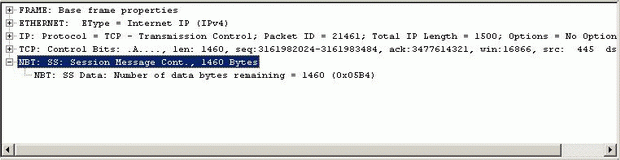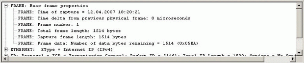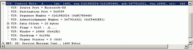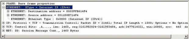 - средняя панель — структура выделенного в верхней панели фрейма; рис. 16.39 — общие сведения о фрейме (дата, время, размер); рис. 16.40 — информация о протоколе канального уровня Ethernet (физические адреса адаптера-отправителя и адаптера-получателя, тип протокола — IPv4); рис. 16.41 — содержимое заголовка протокола IP; рис. 16.42 — содержимое заголовка протокола TCP; рис. 16.43 — сама информация, передающаяся по сети (в данном случае — информация о сессии протокола NetBIOS);