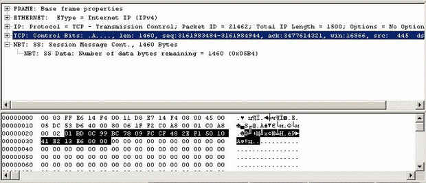 - нижняя панель — содержимое фрейма в шестнадцатиричном и символьном виде; содержимое той части фрейма, которая выделена в средней панели, в нижней панели выделено инверсным цветом (рис. 16.44).