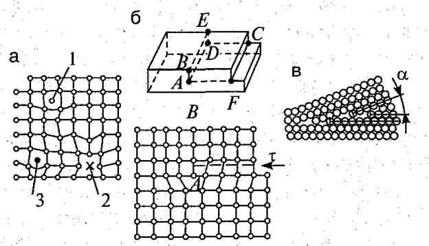 а - точечные (1 - дислоцированный атом; 2 - вакансия; 3 - примесный атом внедрения); б - линейные (τ- вектор сдвига); в- поверхностные (α -угол разориентировки субзерен)
