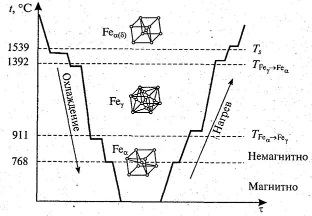 Рис. 1.6. Кривые охлаждения и нагрева железа