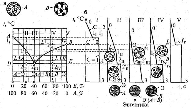 Рис. 1.8. Диаграмма состояния I рода (а), кривые охлаждения сплавов I...V и схемы их структур (б): АСB - ликвидус; DCE – солидус