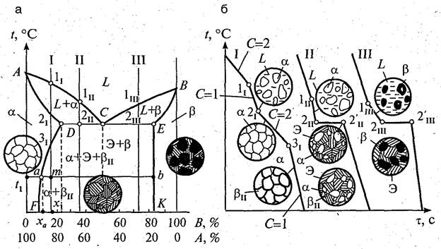 Рис. 1.10. Диаграмма состояния III рода (а), кривые охлаждения сплавов I, II, III и схемы их структур (б)