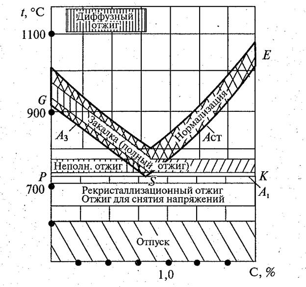 Рис. 3.1. Фрагмент диаграммы Fe-Fe3C и температурные области нагрева при термической обработке сталей
