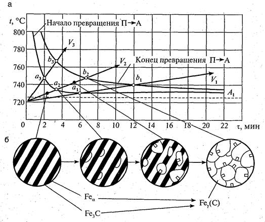 в FeY углерода из распадающихся кристаллов цементита. Полиморфное превращение идет с более высокой скоростью, поэтому после завершения превращения аустенит сохраняет неоднородность по углероду, для устранения которой требуется время (выдержка). Для определения длительности превращения используют диаграмму изотермического превращения перлита в аустенит (рис. 3.2, а), из которой видно, что чем меньше температура, тем больше времени необходимо для завершения процесса. Лучи на диаграмме соответствуют нагреву с различными скоростями (И, <V2<V3).