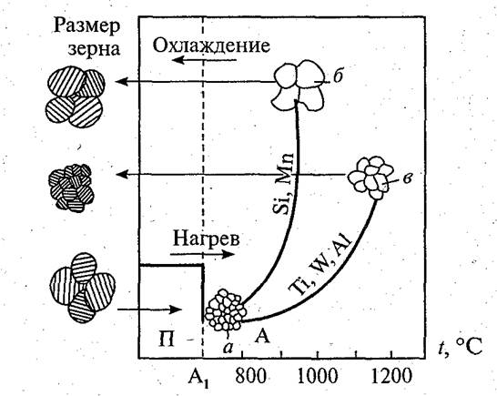 К наследственно мелкозернистым относятся стали, дополнительно раскисленные алюминием, а также легированные титаном, вольфрамом и ванадием. В этих сталях при нагреве до 1000-1100 °С кристаллы аустенита растут с малой скоростью. Такое поведение сталей объясняется тем, что присутствующие в них оксиды и нитриды алюминия, титана, ванадия, а также карбиды титана и ванадия располагаются по границам зерен в виде мелких включений и механически препятствуют их росту при нагреве. При температурах выше 1000- 1100 °С происходит растворение этих включений в аустените, в результате чего устраняется препятствие для роста зерен.