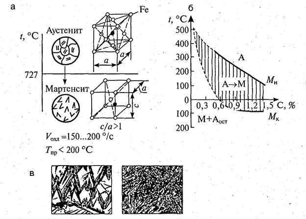 а - механизм превращения и строение кристаллической решетки; б- влияние содержания углерода на положение мартенситных точек; в - микроструктура крупноигольчатого мартенсита и остаточного аустёнита в стали с 1,6 % С (вверху) и мелкоигольчатого мартенсита в стали с 0,5 % С (внизу)