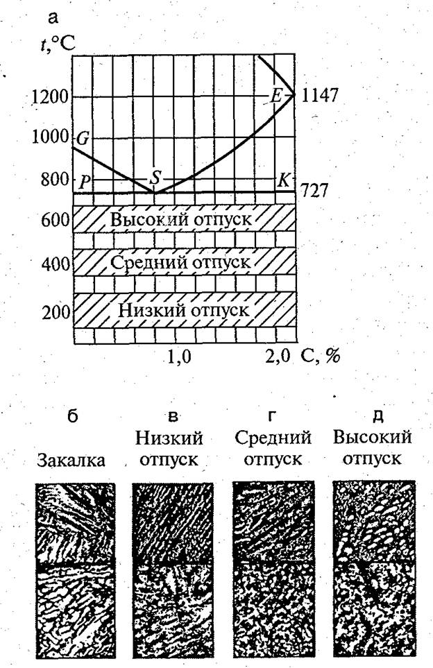 Рис. 3.12. Температурные области нагрева под отпуск (а),, структуры закалки и продуктов ее распада: 6 - мартенсит закалки; в - мартенсит отпуска; г - троостит отпуска; д - сорбит отпуска