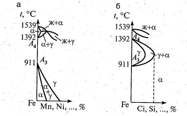 Вторая группа элементов, таких как хром, молибден, вольфрам, ванадий, алюминий, кремний, понижает температуру точки А4 и повышает температуру точки А3, сужая область у-железа на диаграмме (рис. 5.2, б). Сплавы при определенном содержании легирующего элемента этой группы в интервале температур от комнатной до температуры плавления представляют собой твердый раствор легирующего элемента в а-железе и называются сталями ферритного класса.
