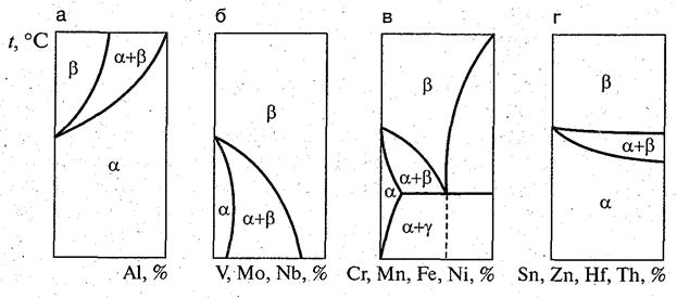 Рис. 6.8. Схемы диаграмм состояния титан - легирующий элемент: а - Ti - а-стабилизаторы; б -Ti - изоморфные р-стабилизаторы; в - Ti - эвтектоиднообразующие р-стабилизаторы; г - Ti - нейтральные элементы
