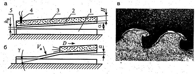 Сварка взрывом слоистых КМ позволяет соединять любые материалы с высокой прочностью, в том числе без нагрева, без вакуума за счет высоких удельных давлений в условиях косого соударения свариваемых материалов и эффекта самоочистки свариваемых поверхностей (рис. 7.5, а, б). Установочные параметры h0, a, H, параметры сварки у, VH и скорость детонации D будут рассмотрены в § 20.5. Структура зоны соединения биметаллического инструмента из быстрорежущей стали Р6М5 и стали 40Х представлена на рис. 7.5, в.