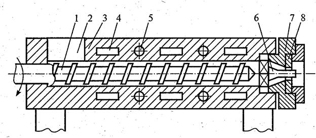 1 - шнек; 2 - загрузочное отверстие; 3 - цилиндр; 4 - водяной или паровой обогрев; 5 - воздушное охлаждение; 6 - дорн; 7 - головка цилиндра; 8 -