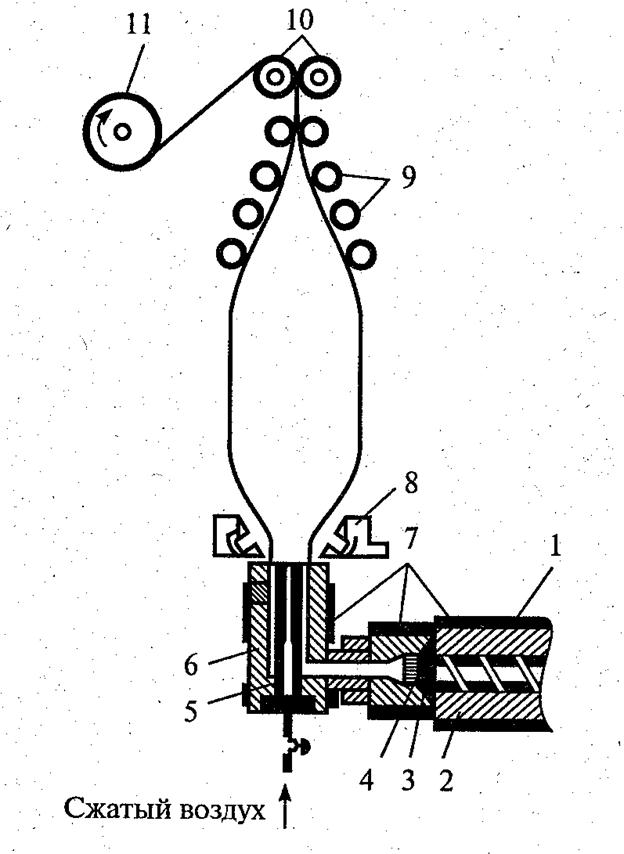 ■" Рис. 9.7. Схема изготовления пленки раздуванием трубы вверх: 1 - шнек; 2-цилиндр экструдера; 3 и 4-фильтрующие сетка и решетка; 5- дорн; 6- оформляющая головка; 7-электрические нагреватели; £-охлаждающее устройство; 9-направляющие ролики; 10- захватывающие валики;