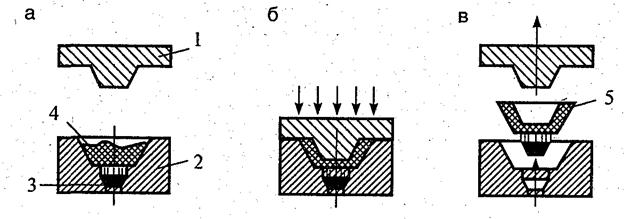 а - загрузка шихты в пресс-форму; б - прессование; в - извлечение изделия; 1 - пуансон; 2 - матрица; 3 - выталкиватель; 4 - пресс-материал; 5 -