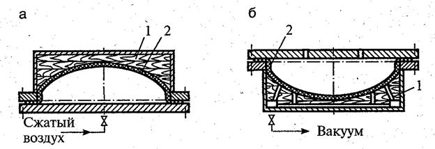 Рис. 9.9. Схема пневматического (а) и вакуумного (б) прессования: 1 - матрица; 2 - изделие