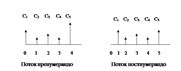 Одним из основных элементов финансового анализа является оценка денежного потока С1, С2, …, Сn , генерируемого в течение ряда временных периодов в результате реализации какого-либо проекта или функционирования того или иного вида активов. Элементы потока Сi могут быть либо независимыми, либо связанными между собой определенным алгоритмом. Временные периоды чаще всего предполагаются равными. Хотя данное условие в принципе не является обязательным, в дальнейшем мы будем придерживаться его. Кроме того, для простоты изложения материала предполагается, что элементы денежного потока являются однонаправленными, т.е. нет чередования оттоков и притоков денежных средств. Также считается, что генерируемые в рамках одного временного периода поступления имеют место либо в его начале, либо в его конце, т.е. они не распределены внутри периода, а сконцентрированы на одной из его границ. В первом случае поток называется потоком пренумерандо, или авансовым, во втором — потоком постнумерандо (рис. 7.5).