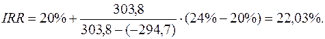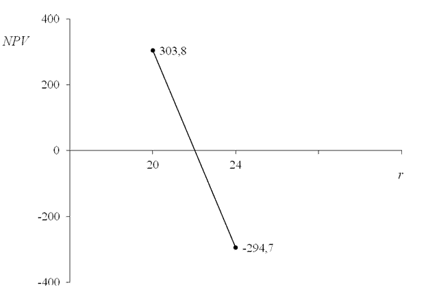 Пример 4.2. Ранее, в примере 4.1, мы определили, что при цене капитала проекта r = 20% приведенная норма доходности NPV составляет 303,8 тыс. руб., а при r = 24% приведенная норма доходности NPV составляет -294,7 тыс. руб.