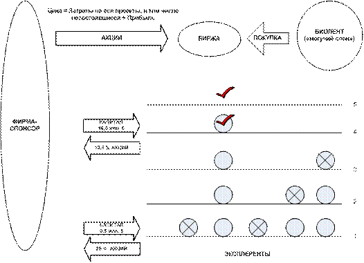 Кружком обозначены фирмы-пионеры, получившие возможность воспользоваться поддержкой. Если кружок перечеркнут крестом, значит, у фирмы не получился перспективный результат, и ее финансирование прекращается. По получении продукта инвестор продает все акции эксплерента на бирже по цене, включающей: