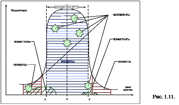 Положение фирмы-пионера, которое она может занять на кривой спроса, определяется продуктом, который ей удается получить. Если продукт станет массовым, фирма может занять место на виолентном поле, если – узкоспециализированным, то одно из патиентных полей. Кривая спроса эксплерентов представлена на рис. 1.10.