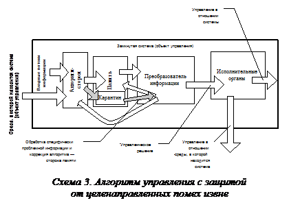 В ней информация, поступающая из внешней среды, достоверность которой сомнительна, алгоритмом-сторожем загружается в «буферную память» временного хранения (на схеме она обозначена надписью «Карантин»). Некий алгоритм-ревизор в «Преобразователе информации», выполняя в данном варианте роль защитника мировоззрения и миропонимания от внедрения в них недостоверной информации, анализирует информацию в буферной памяти «Карантина» и присваивает ей значения: «ложь» — «истина» — «требует дополнительной проверки» и т.п. Только после этого определения и снабжения информационного модуля соответствующим маркером («ложь» — «истина» и т.п.) алгоритм-ревизор перегружает информацию из «Карантина» в долговременную память, информационная база которой обладает более высокой значимостью для алгоритма выработки управленческого решения, чем входные потоки информации. Также «Преобразователь информации» осуществляет совершенствование алгоритма-сторожа, распределяющего входной поток информации между «Карантином» и остальной памятью.