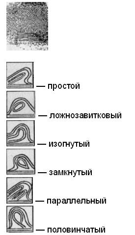 Дуговой узор наиболее прост по строению, линии идут от одного края подушечки пальца к другому, дельт не образуют. Различают дуговые узоры: