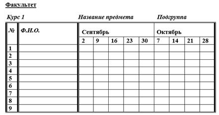 Создайте журнал (таблицу) учета текущей успеваемости студентов вашей подгруппы по информатике в сентябре и октябре месяцах, следующего вида