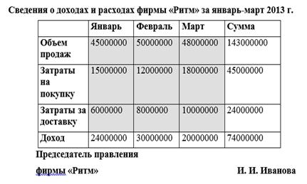 Для вычисления доходов, расположенных в пятой строке, необходимо при помощи команды Макет/Формула ввести в клетки этого столбца формулы: =b2-(b3+b4), =c2-(c3+c4), =d2-(d3+d4).