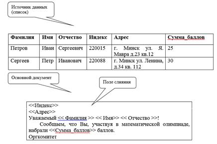 Слияние документов - это объединение основного документа, содержащего постоянную часть информации, и источника данных, содержащих переменную часть. Примером слияния документов может быть персонализация писем. Текст делового письма постоянный, например, сообщение участникам математической олимпиады. Это основной документ. Такое письмо нужно выслать участникам олимпиады. Переменным является Фамилия И.О. участника, его адрес, набранные баллы. Данные об участниках представляют собой источник данных (список). Слияние проходит по следующей схеме.