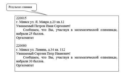 В результате слияния основного документа и источника данных (списка) для каждого участника из списка готовится письмо. В итоге получается несколько писем одинакового содержания.
