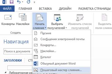 Слияние документов выполняется в диалоговом окне «Слияние», вызываемом командой Рассылки/Начать слияние/Пошаговый мастер слияния.