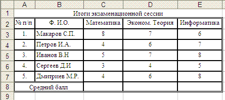 2. Необходимо также заполнить ячейки С8, D8 и E8, в которых с использованием функции СРЗНАЧ() необходимо рассчитать средний балл по каждому из трех предметов.
