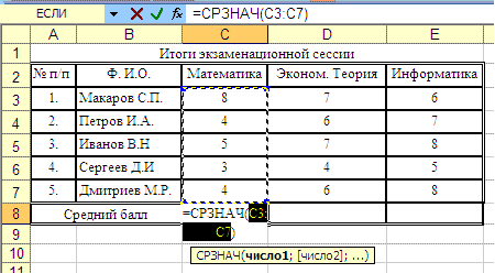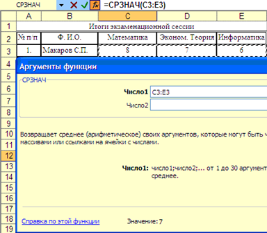 После нажатия ОК будет подсчитан средний балл студента Макарова С.П. за сессию и я ячейке C12 появится значение 7: