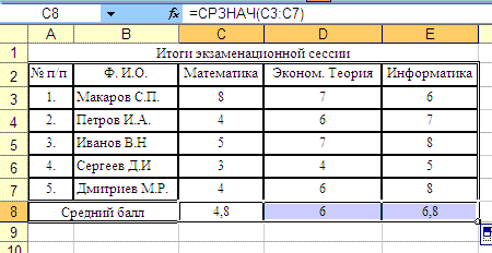 Останется лишь, вновь сделав активной ячейку C8, переместить курсор мыши к ее правому нижнему углу (так, чтобы он выглядел как черный крестик), нажать на левую кнопку мыши и, не отпуская ее, скопировать содержимое в ячейки D8 и E8. В результате получим три средних значения оценок по трем предметам: