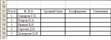 3. Далее необходимо подготовить таблицу для расчета стипендий студентов, продублировав их порядковые номерами фамилии (Ф.И.О.), а в качестве трех других заголовков столбцов записать Средний балл, Коэффициент и Стипендия (то есть переменные s, k и m):