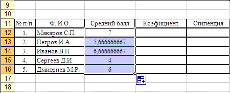 Для этого необходимо сделать активной ячейку C12 и подведя к ее правому нижнему углу указатель мыши, нажать левую клавишу мыши и скопировать значения в ячейки С13, С14, С15 и С16. Таким образом, будут подсчитаны средние баллы всех студентов: