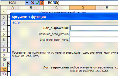 и вернемся ко вводу аргументов функции ЕСЛИ(), установив курсор мыши в строке формул после слова ЕСЛИ перед открывающей скобкой: