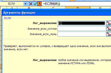 Для их записи установим курсор мыши в окно ввода логического выражения функции ЕСЛИ() и запишем И()