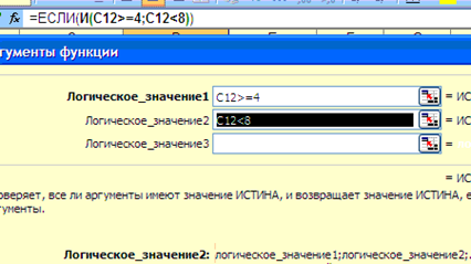 Введем аргументы – в качестве первого – С12>=4, в качестве второго С12<8: