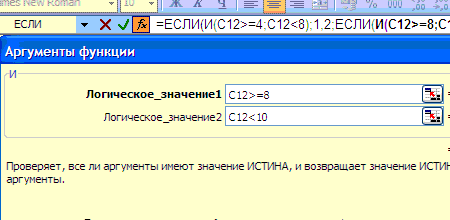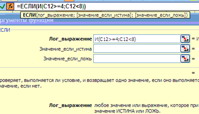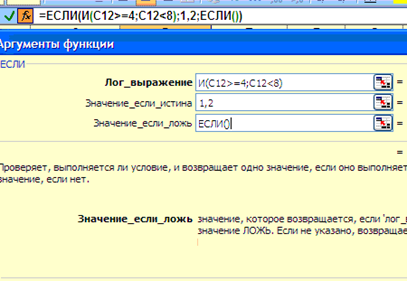 После ввода значения ЕСЛИ(), необходимо вновь установить указатель мыши в строке формул, после второго ЕСЛИ перед открывающей скобкой. Будет вновь предложено окно для ввода аргументов функции ЕСЛИ(), на сей раз – первой вложенной. Как и в предыдущем случае, введем в окно Логического_значения функцию И(), перейдем в окно ввода аргументов уже для нее и в качестве аргументов введем – в качестве первого – С12>=8, в качестве второго С12<10: