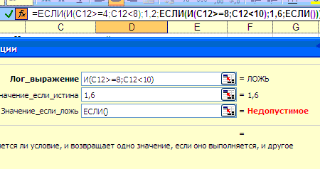 =ЕСЛИ(И(C12>=4;C12<8);1,2;ЕСЛИ(И(C12>=8;C12<10);1,8;ЕСЛИ(C12=10;2;"неправильные данные")))