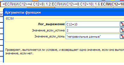 При вводе аргументов в третью вложенную функцию ЕСЛИ()условие формулируется проще C12=10, соответственно, нет необходимости в задействовании функции И(). В том случае, если данное условие выполняется, коэффициент равен 2, в том случае, если нет, то (с учетом того, что задействованы все возможные варианты значения среднего балла от 4 до 10 включительно) необходимо вывести текстовое значение “неправильные данные“.