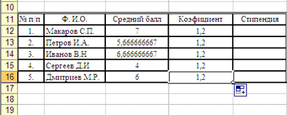 Скопируем данную формулу в диапазон E12:E16 и получим значения стипендий всех студентов.