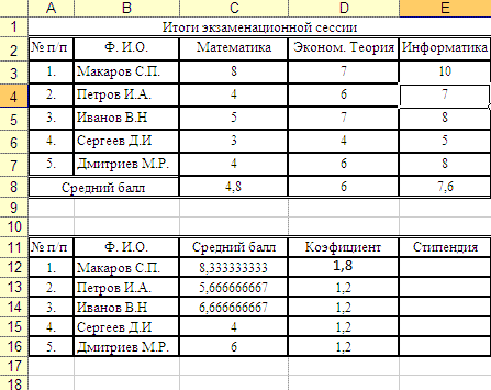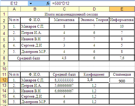 6. Остается лишь по известному коэффициенту найти размер стипендии студента Макарова С.П. (просто умножив коэффициент на размер минимальной стипендии – пусть он будет равен 500), а затем, скопировав функцию в остальные ячейки – стипендий остальных студентов.