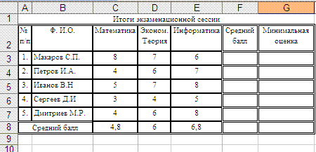 Дополним таблицу двумя столбцами – Средний балл, в которую внесем Средний балл каждого из студентов и Минимальная оценка, в которую внесем минимальную оценку каждого из студентов, полученную во время сессии.