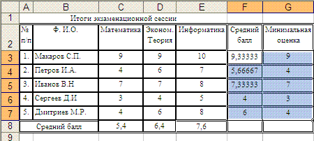 Далее выделим ячейки F3 и G3, подведем курсор мыши к правому нижнему углу ячейки G3 так, чтобы он принял вид маркера автозаполнения (“черный крестик“), и, нажав на левую кнопку мыши скопируем содержимое ячеек F3 и G3 в диапазон F4:G7, где должны размещаться средние и минимальные оценки за сессию всех остальных студентов:
