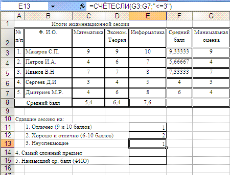 3. Для подсчета количества неуспевающих студентов вновь воспользуемся столбцом Минимальная оценка. У таких студентов минимальная оценка очевидно, будет больше либо равна 3. С использованием функции СЧЕТЕ СЛИ произведем подсчет количества таких студентов, то есть подсчет количества значений меньших либо равных 3 в диапазоне G3:G7, в который внесена минимальная оценка, полученная каждым студентом за сессию. Результат выполнения функции = СЧЁТ ЕСЛИ (G3:G7;"<=3") внесем в ячейку E13: