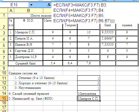 Наконец, для определения (5) ФИО студента, получивший наивысший средний балл будут задействованы функции МАКC (с помощью которой определяется максимальное из группы чисел) и опять же ЕСЛИ. При определении необходимо последовательно сравнить максимальный из пяти возможных средний балл МАКС (F3:F7) со средним баллом каждого из пяти студентов, и в случае совпадения выдать в качестве результата фамилию этого студента.