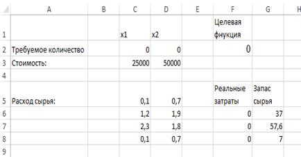 Для переменных x1,x2 определим соответственно ячейки С2:D2, и зададим им начальные значения, равные нулю. Затем коэффициенты целевой функции и нормы расхода сырья расположим под неизвестными в ячейках С3:D3 и С6:D8 соответственно. Запасы сырья расположим справа от матрицы норм расхода в ячейках G6:G8. В ячейке F2 вычислим значение целевой функции, а в ячейках F6:F8 ‑ реальный расход сырья.