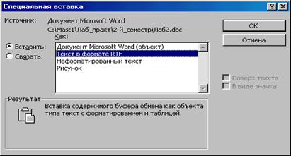 Для внедрения и связывания передаваемые данные одной программы заносятся в буфер обмена и затем при помощи команды Правка / Специальная вставка помещаются в другую программу. Диалоговое окно этой команды имеет вид: