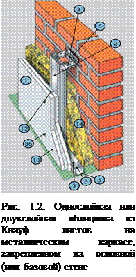 Однослойная или двухслойная облицовка из Кнауф листов на металлическом каркасе, закрепленном на основной (или базовой) стене приведена на рис. 1.2 (номера позиций указаны в табл.1.2).